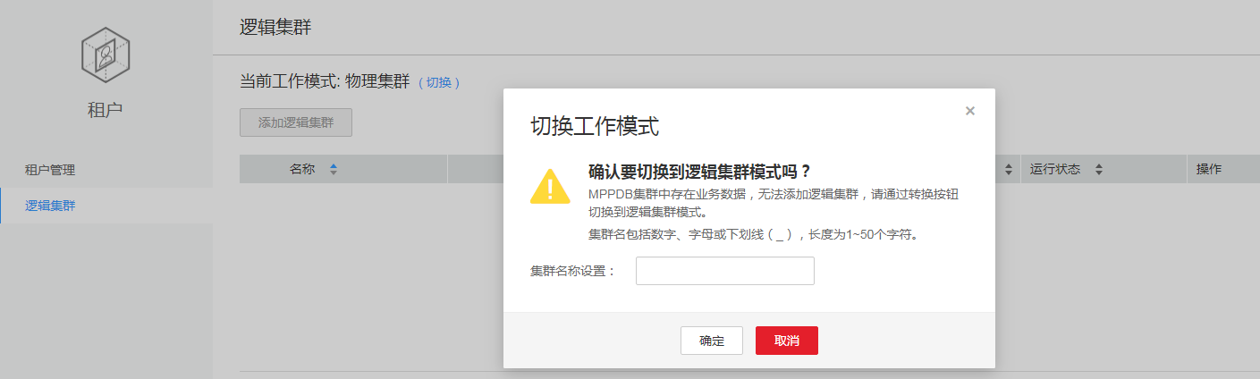 MPPDB集群存在业务数据时才支持集群模式的切换,如无业务数据,请通过“添加逻辑集群”的方式创建逻辑集群,参见添加逻辑集群。