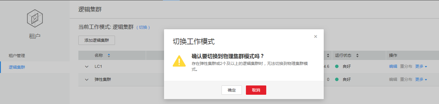 - 在集群下拉列表中选择待操作的集群,在“ 逻辑集群”页面上方,单击“切换”,弹出“切换工作模式”的对话框,单击“确定”。
