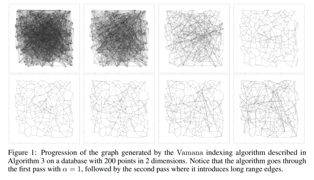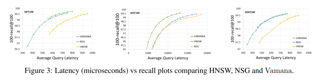 - Vamana 搜索性能不慢于目前最好的图索引 NSG 和 HNSW。