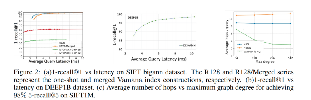 一、 基于内存的索引比较:Vamana VS. NSG VS. HNSW数据集:SIFT1M(128 维), GIST1M(960 维), DEEP1M(96 维) 以及从 DEEP1B 中随机采样了 1M 的数据集。Vamana: R = 70, L = 75, alpha = 1.2.NSG: R = 60, L = 70, C= 500.论文里没有给搜索参数,可能和建索引参数一致。对于这个参数选择,文中提到 NSG 的参数是根据 NSG 的github repository 里列出的参数中选择出性能比较好的那组,Vamana 和 NSG 比较接近,因此参数也比较接近,但是没有给出 HNSW 的参数选择理由。在笔者看来,HNSW 的参数 M 选择偏大,同为图索引,出度应该也要在同一水平才能更好做对比。在上述建索引参数下,Vamana、HNSW 和 NSG 建索引时间分别为 129s、219s 和 480s。NSG 建索引时间包括了用 EFANN [3] 构建初始化近邻图的时间。从 Figure 3 可以看出,Vamana 在三个数据集上都有着优秀的表现,和 NSG 比较接近,比 HNSW 稍好。 这个结果可以看 Figure 2.c,从图中可以看出 Vamana 相比 NSG 和 HNSW,在相同召回率下平均搜索路径最短。二、 比较一次性建成的索引和多个小索引合并成一个大索引的区别一次建成的索引参数:L = 50, R = 128, alpha = 1.2. 在 1800G DDR3 的机器上跑了 2 天, 内存峰值大约 1100 G,平均出度 113.9。1、将数据集用 kmeans 训练出 40 个簇;3、对每个簇建 L = 50, R = 64, alpha = 1.2 的 Vamana 索引;这个索引生成了一个 384G 的索引,平均出度 92.1。这个索引在 64G DDR4 的机器上跑了 5 天。3. 基于合并的索引方案也适用于 DEEP1B 数据集(Figure 2b)。三、 基于磁盘的索引:DiskANN VS. FAISS VS. IVF-OADC+G+PIVFOADC+G+P 是参考文献 [5] 提出的一种算法。这篇论文只和 IVFOADC+G+P 比较,因为参考文献 [5] 中已经证明比 FAISS 要更优秀,另外 FAISS 要用 GPU,并不是所有平台都支持。IVF-OADC+G+P 好像是一个 hnsw + ivfpq。用 hnsw 确定 cluster,然后在目标 cluster 上加上一些剪枝策略进行搜索。结果在 Figure 2a里。图里的 16 和 32 是码本大小。数据集是 SIFT1B,用的 OPQ 量化。 代码实现细节