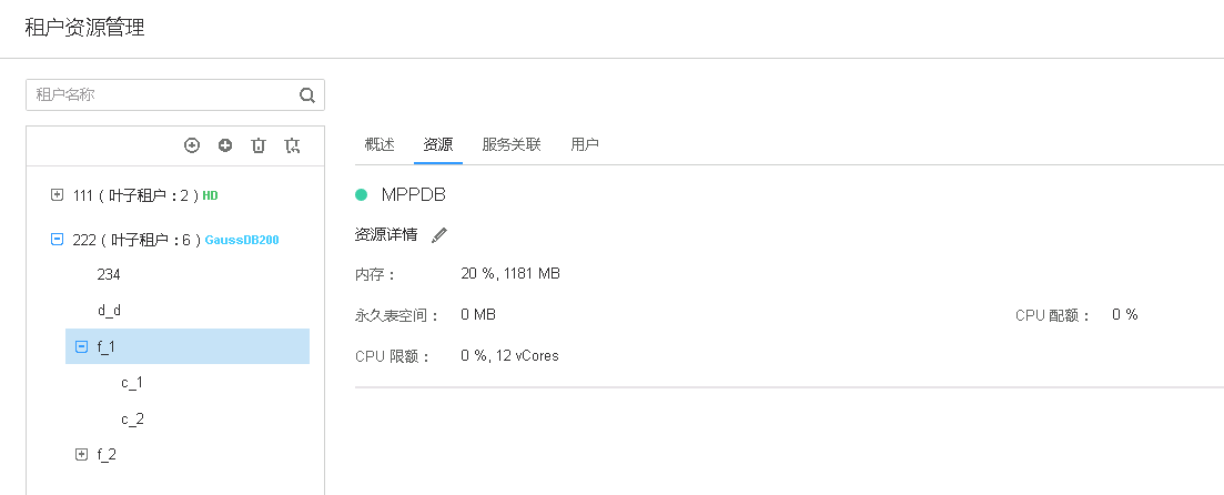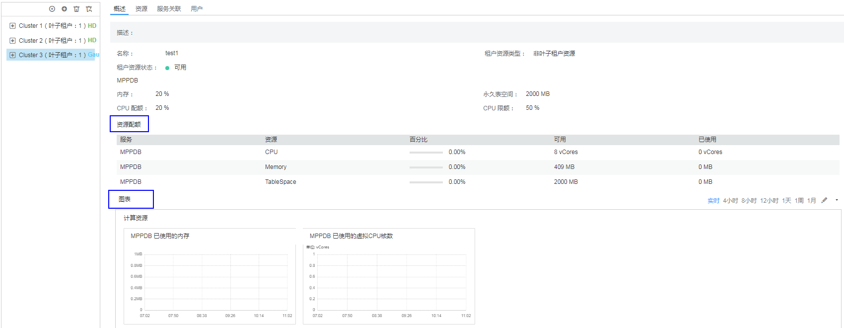 - “资源配额”:可以查看租户可用和已使用的CPU、内存和表空间大小。