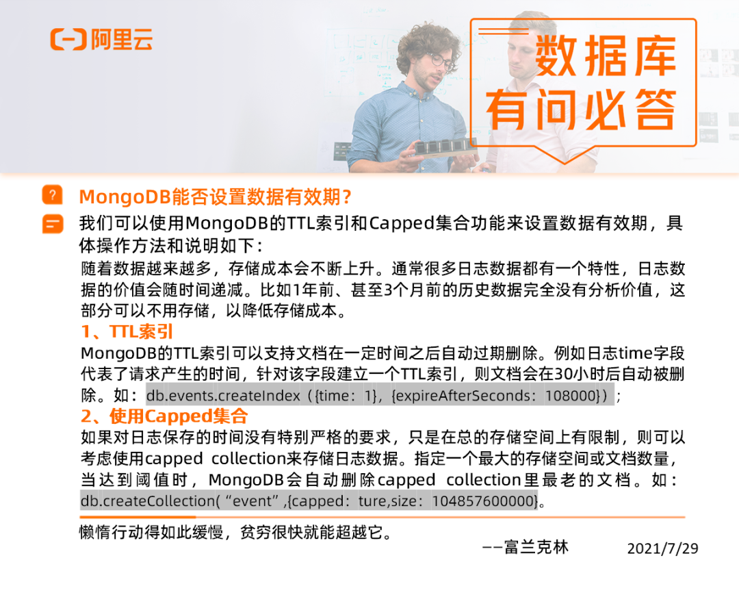 如果对日志保存的时间没有特别严格的要求,只是在总的存储空间上有限制,则可以考虑使用capped collection来存储日志数据。指定一个最大的存储空间或文档数量,当达到阈值时,MongoDB会自动删除capped collection里最老的文档。如:db.createCollection(“event”,{capped:ture,size:104857600000}。