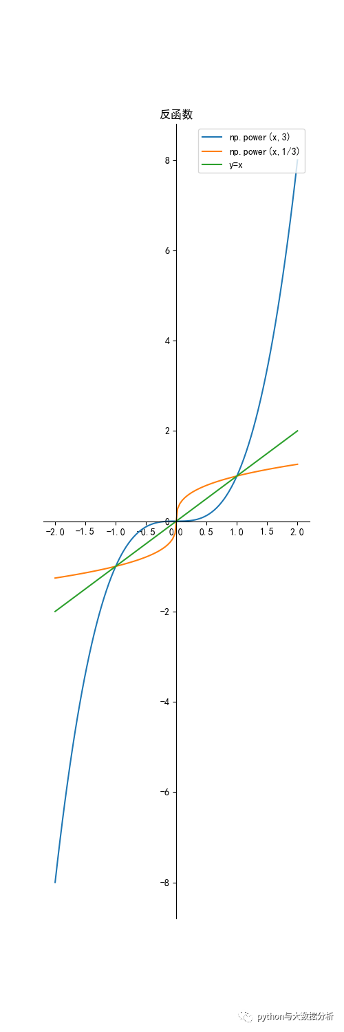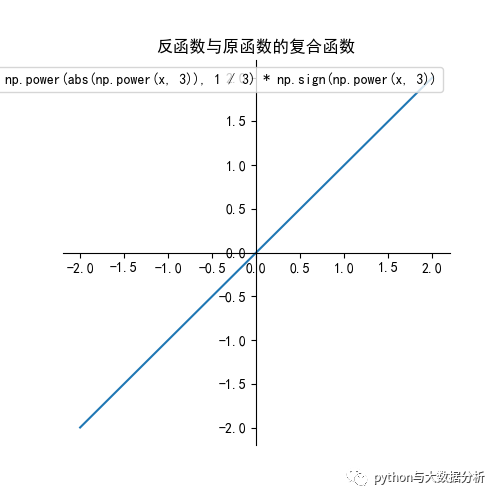 def inversefunction(): plt.figure(figsize=(5, 15)) ax = plt.gca() # 通过gca:get current axis得到当前轴 plt.rcParams['font.sans-serif'] = ['SimHei'] # 绘图中文 plt.rcParams['axes.unicode_minus'] = False # 绘图负号 x = np.linspace(-2, 2, 100) y1 = np.power(x, 3) y2 = np.power(abs(x), 1 / 3) * np.sign(x) y3 = x label = 'np.power(x,3)' plt.plot(x, y1, label=label) label = 'np.power(x,1/3)' plt.plot(x, y2, label=label) # plt.plot(y1,x,label=label) # np.power(x,1/3)和x,y1调换一下是等价的 label = 'y=x' plt.plot(x, y3, label=label) # 设置图片的右边框和上边框为不显示 ax.spines['right'].set_color('none') ax.spines['top'].set_color('none') # 挪动x,y轴的位置,也就是图片下边框和左边框的位置 # data表示通过值来设置x轴的位置,将x轴绑定在y=0的位置 ax.spines['bottom'].set_position(('data', 0)) # axes表示以百分比的形式设置轴的位置,即将y轴绑定在x轴50%的位置 # ax.spines['left'].set_position(('axes', 0.5)) ax.spines['left'].set_position(('data', 0)) plt.title("反函数") plt.legend(loc='upper right') plt.show() # 反函数与原函数的复合函数等于x plt.figure(figsize=(5, 5)) ax = plt.gca() # 通过gca:get current axis得到当前轴 plt.rcParams['font.sans-serif'] = ['SimHei'] # 绘图中文 plt.rcParams['axes.unicode_minus'] = False # 绘图负号 x = np.linspace(-2, 2, 100) y1 = np.power(x, 3) y2 = np.power(abs(y1), 1 / 3) * np.sign(y1) label = 'np.power(abs(np.power(x, 3)), 1 3) * np.sign(np.power(x, 3))' plt.plot(x, y2, label=label)