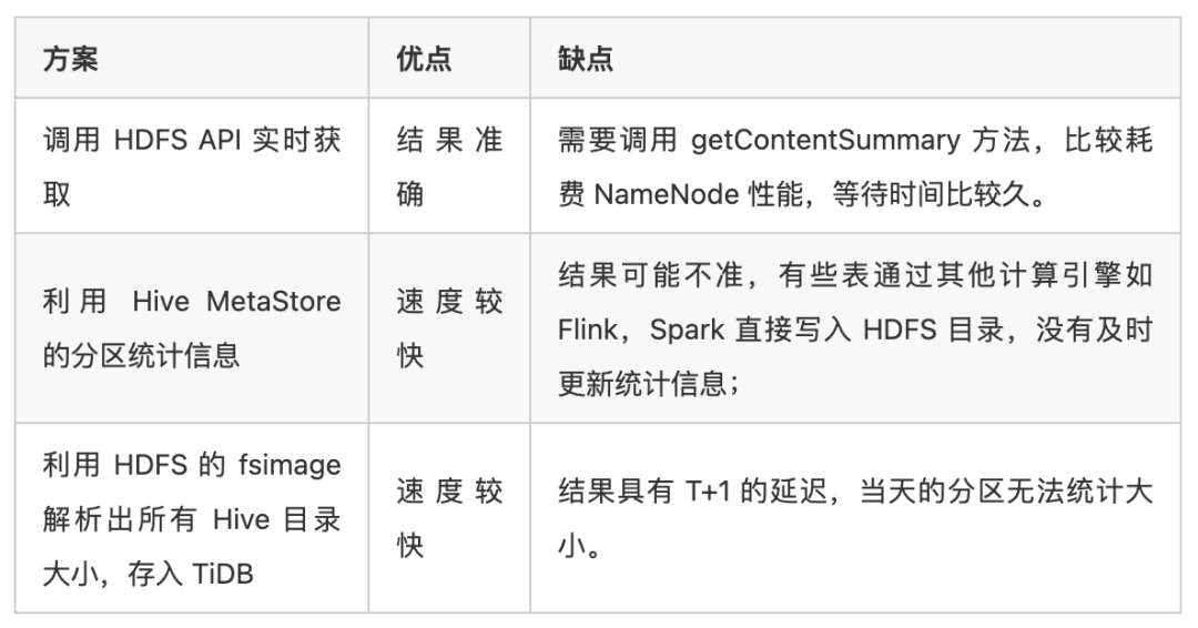 考虑到使用场景,大 SQL 查询大部分情况下都是扫描了几个月甚至几年的数据,一两天的分区信息忽略可以接受,我们选择了第三种方案:每天将 HDFS 的 fsimage 解析,并且计算出每个 Hive 目录的大小,再将结果存入 TiDB。因为我们在其他场景也会用到 fsimage 的信息,所以这里我们不仅仅只存储了 Hive 目录,而是存储了整个 HDFS 的目录情况,近百亿条数据。很明显,在如此大的数据量下,还涉及到数据索引相关,TiDB 是一个很好的选择。