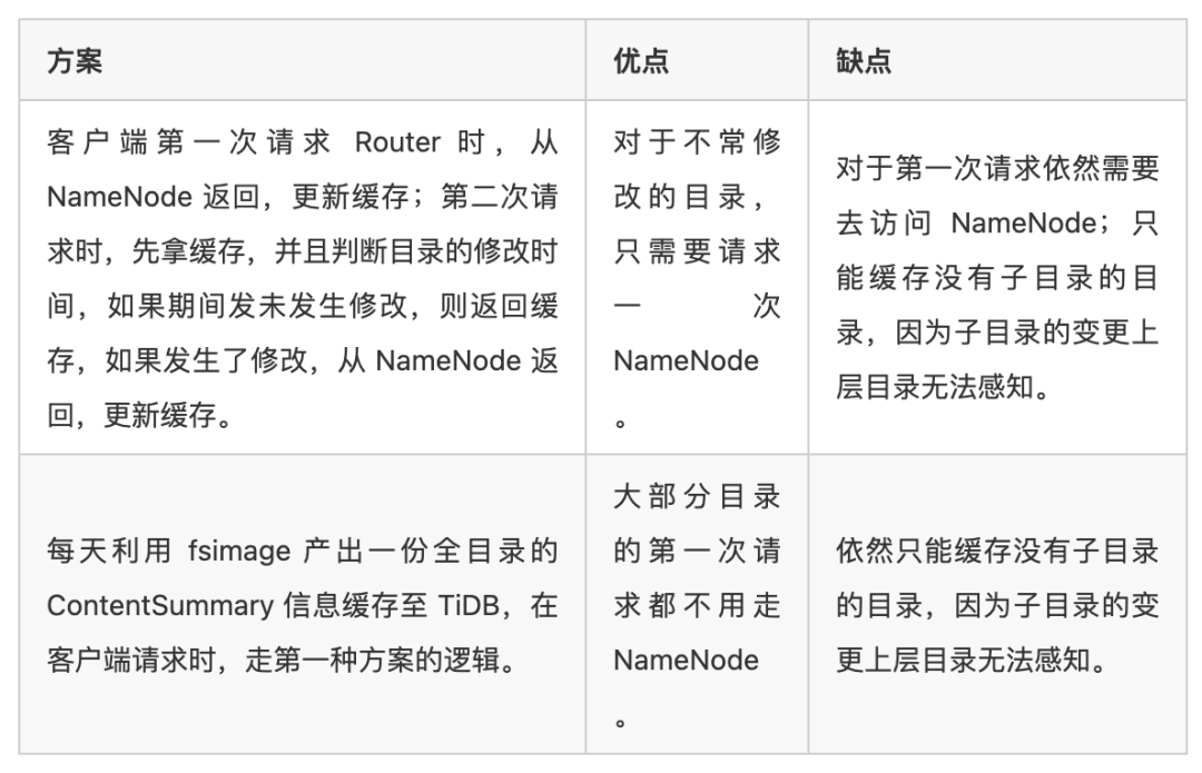 知乎在 2019 年 HDFS 就已经拆分了 Federation, 采取的是 Router Base Federation 的方案,引入了 NameNode 的代理组件 Router. 我们只要在 Router 层给 HDFS 的 ContentSummary 做一层缓存,在客户端发起调用时,如果缓存命中,则从缓存读取,如果缓存未命中,则从 NameNode 请求。经过内部讨论,缓存方案有以下几种: