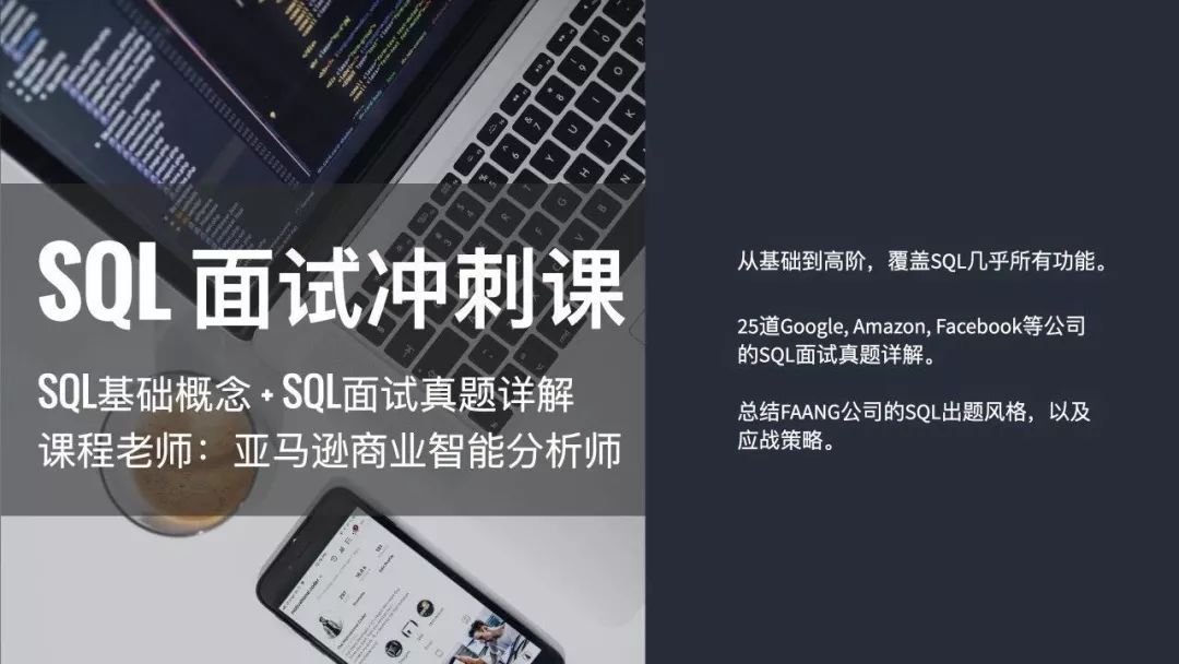 后3小时深入辅导Google、Facebook、Amazon、Apple、Uber、Airbnb等知名公司的SQL面试真题,总结不同公司的SQL出题风格。让你从此不再胆怯SQL面试题!