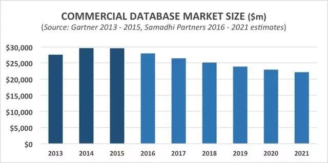 这二十年来,商业数据库市场仍然是IT行业最稳定、最具黏性的领域之一,Oracle、IBM和微软三家厂商瓜分了80%的份额。然而,我们认为这个领域衰退的速度和幅度可能会让许多投资者大吃一惊。