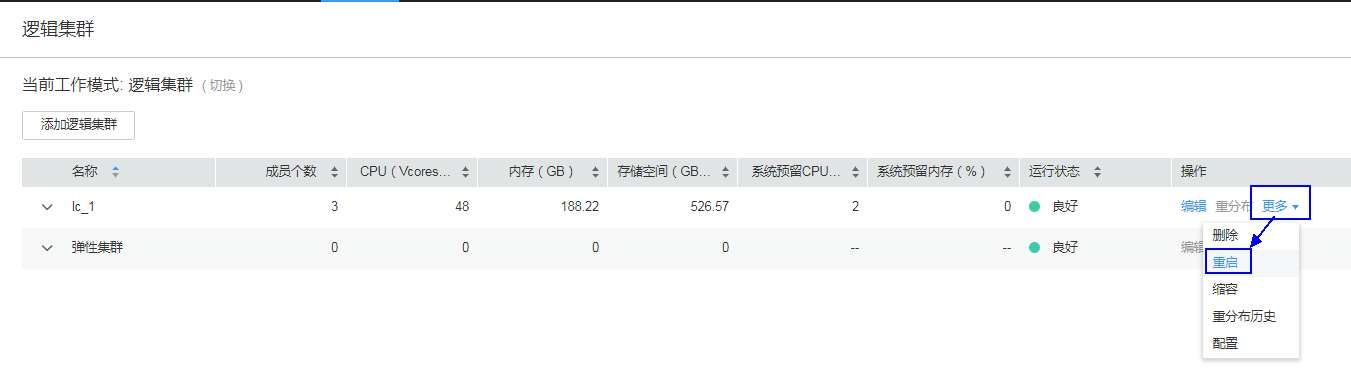 - 在集群下拉列表中选择待操作的集群,在逻辑集群列表中,在需要重启的逻辑集群所在行右侧“操作”列中,选择“更多 > 重启”。