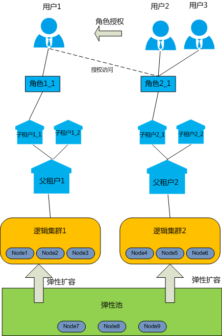 在每个逻辑集群内,客户可以独立管理业务资源,通过用户权限设置,实现逻辑集群内的资源隔离和逻辑集群间的数据互访。