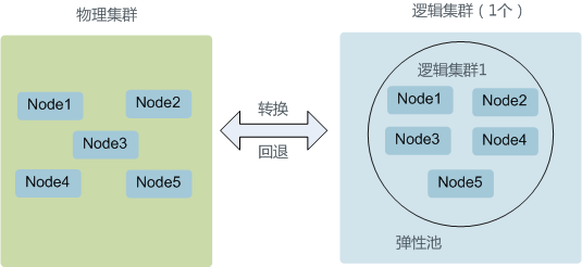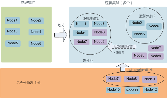 - 通过虚拟扩容方式,从弹性集群中将节点扩容到已有的逻辑集群,也可以通过新建逻辑集群,节点来源于弹性集群。