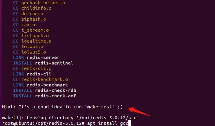 2.下载并解压后之后,进入Redis目录中,执行 make ,通过 make 编译的方式来安装。(如果编译失败则有可能是未装gcc ,安装一下之后继续编译即可)