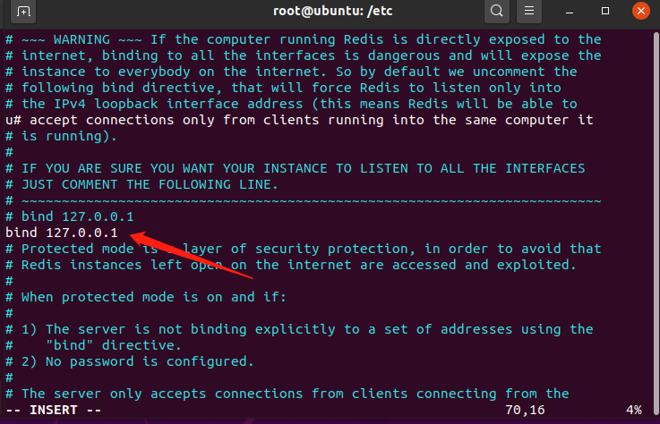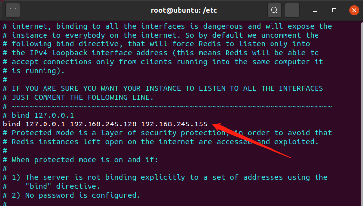 将 Redis监听在 0.0.0.0 是十分危险的,所以需要修改 Redis 监听端口,在 Redis 的配置文件 redis.conf 中进行设置,找到包含 bind 的行,将默认的 bind 0.0.0.0 改为内网IP,然后重启 Redis