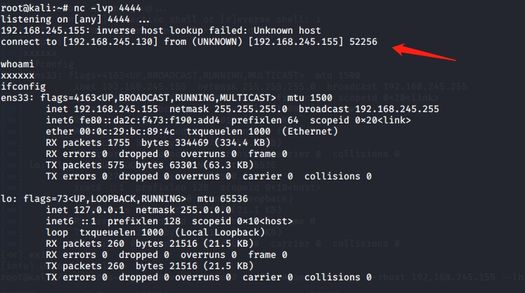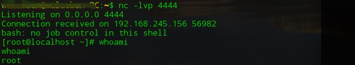 然后大概等一分钟左右可以看到,在攻击机的nc中成功反弹回shell