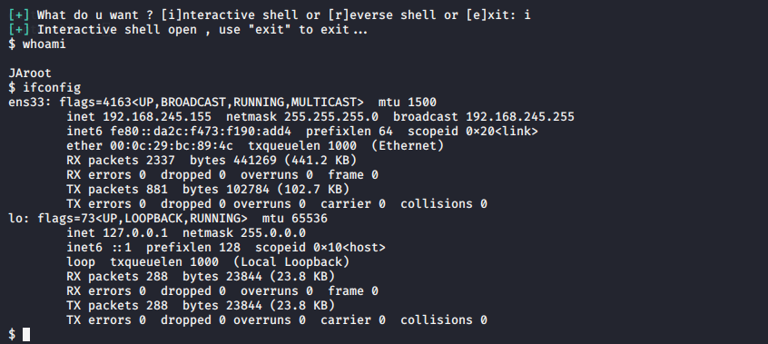 执行后,可以选择获取一个交互式的shell(interactive shell) 或者是反弹shell(reserve shell)