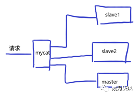 来自客户端的请求通过中间件mycat执行(出mycat外还有其他中间件能实现此功能),后端的mysql无法查看,通过配置mycat的配置文件,将请求中的写造作送给后端的master数据库,读操作给slave数据库。