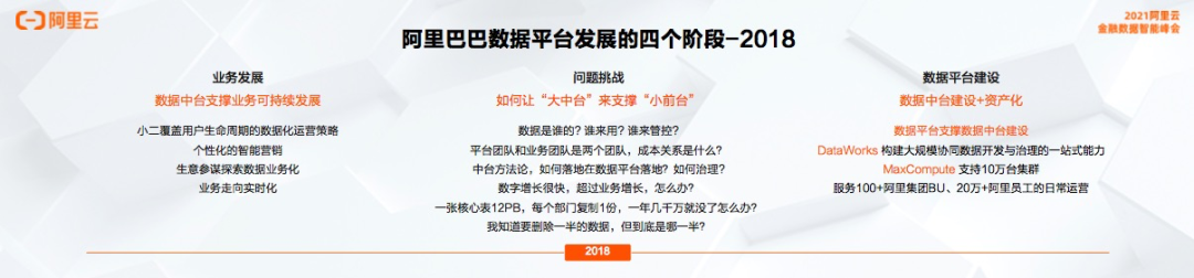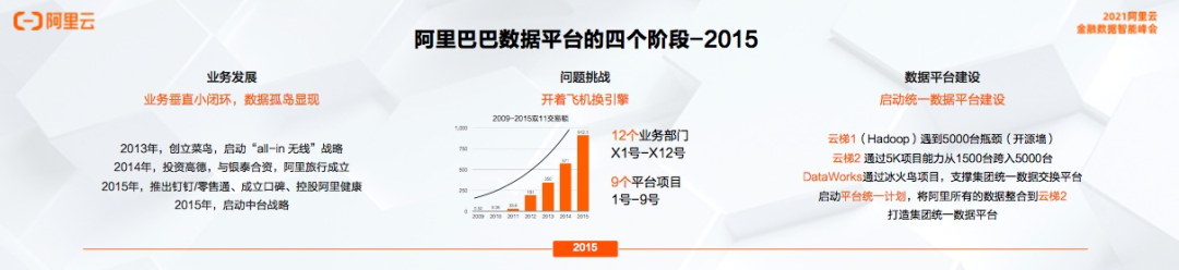 数据孤岛现象开始日益严重,数据成本越来越高,统一的数据平台建设已经迫在眉睫,这也是阿里巴巴数据中台的起点。