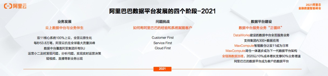 阿里巴巴从2018年内部所有系统开始上云,到2021年实现了云上数据中台与业务伴生:双11核心系统100%上云,阿里巴巴全面云原生化;每秒53.8万笔,阿里云抗住全球最大流量洪峰;数据中台覆盖阿里集团所有BU;运营小二及时发现问题、分析问题,实现实时运营决策;短视频、直播等新业务继续涌现……