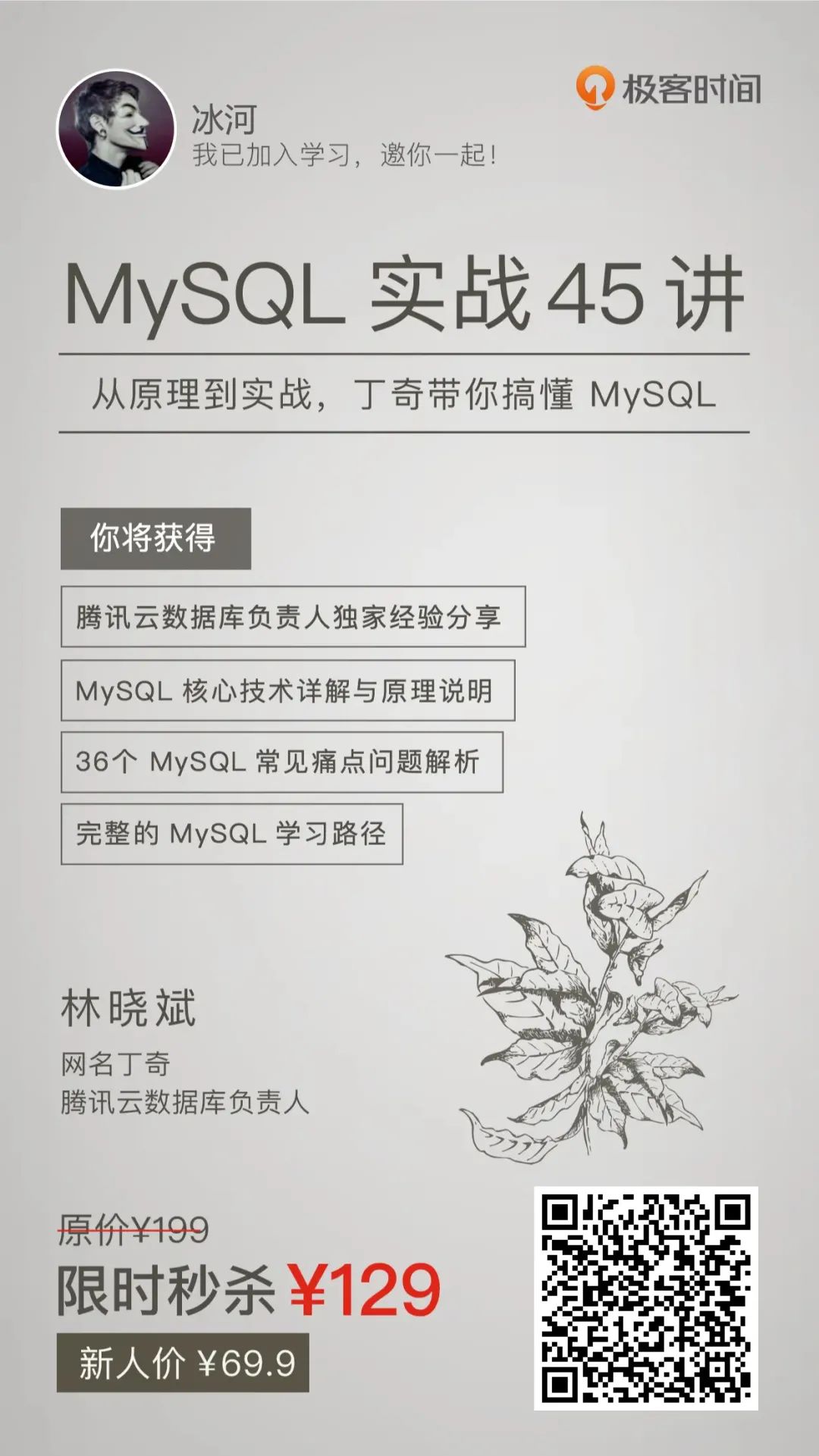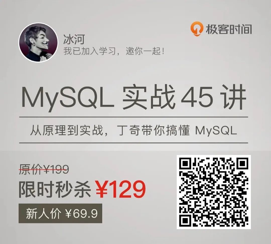 仔细想想,我当初在用 MySQL 的过程中,遇到的问题也是五花八门,从开发技巧到管理维护,从性能问题到安全问题。第一个感受就是,MySQL 本身是个设计优良的系统,其中有很多巧妙的设计思路,比如 WAL 机制、索引的实现、缓存的处理方式等等,掌握好这些,能解决日常工作中的很多问题。那会儿,也没少在网上找资料,虽说有所收获,但内容大多脱离真实的软件开发,看的时候各种明白,上手实操就原形毕露了。后来刷微博,看到诸霸转发了数据库大佬——丁奇的专栏《MySQL 实战 45 讲》。这个专栏对我的影响很大,跟着学下来,让我对 MySQL 的理解上了一个新的高度。毫不夸张的说,这是我看过的最好的 MySQL 教程,口碑一级棒,已经将近 80000 人订阅,基本上人手一份了。最近有活动,发布了特别优惠口令,推荐给大家(手慢就没了)!