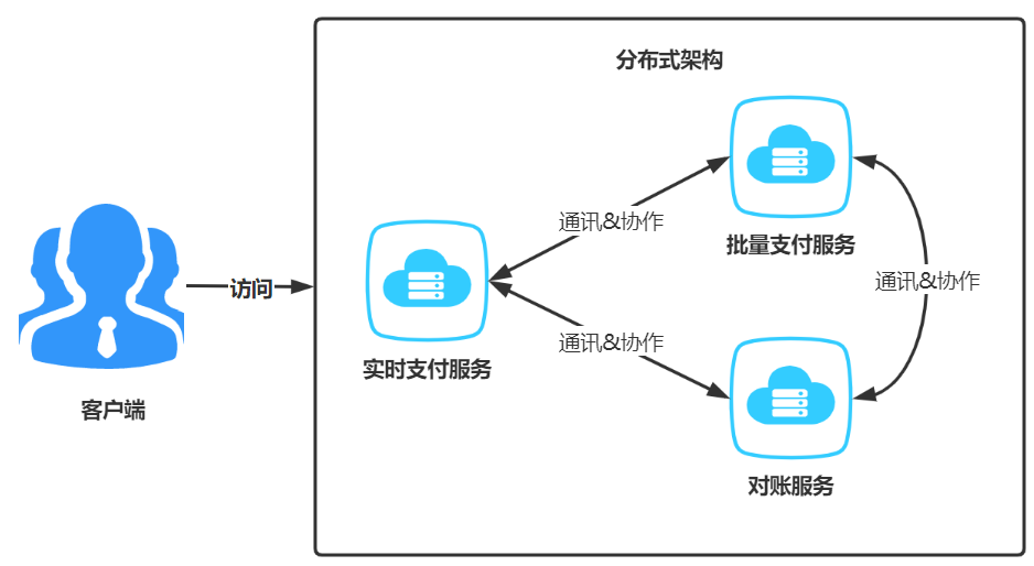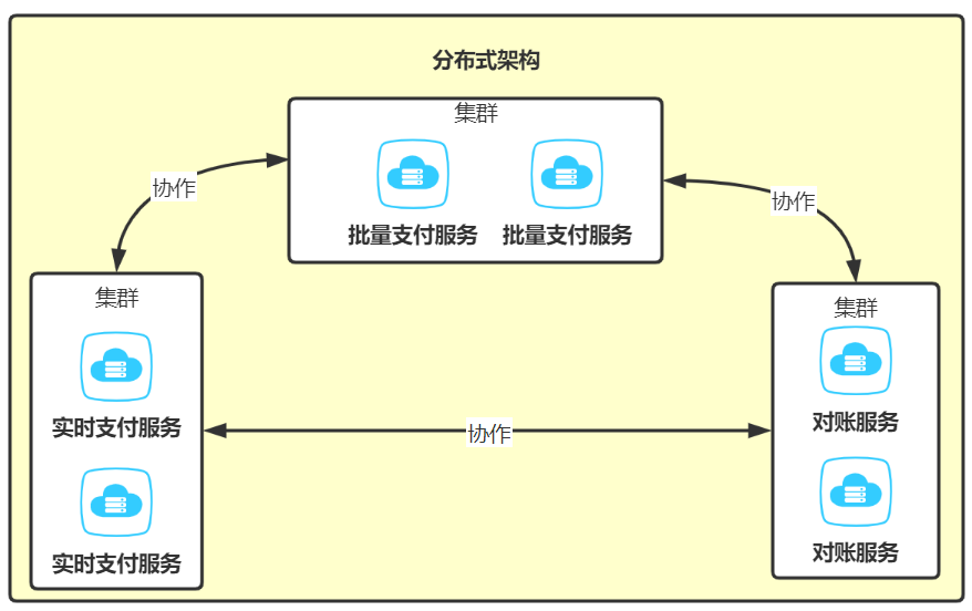 而分布式架构的每个节点都是不同的,例如将支付系统拆分为实时支付服务、批量支付服务、对账服务,3个服务提供的功能彼此不同,相互协作成为一个系统生态,再对外提供服务。