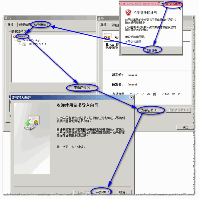 ,选择“设置 > 显示高级设置 > HTTPS/SSL(管理证书)”。 - 在弹出的“证书”对话框中,选择“受信任的根证书颁发机构”,单击“导入”,单击“下一步”。