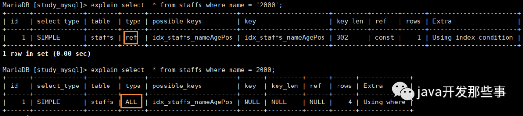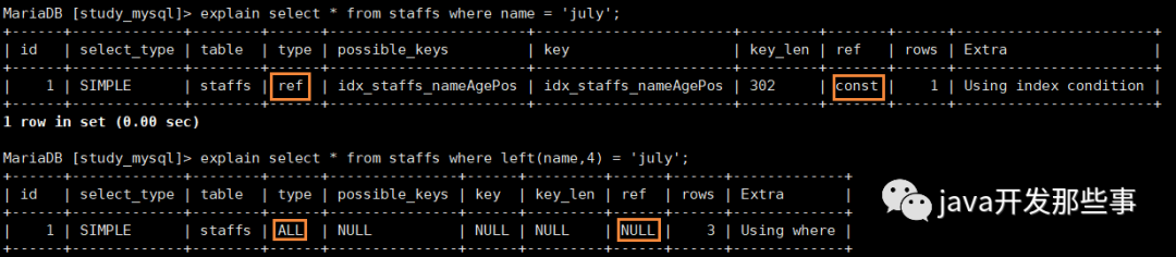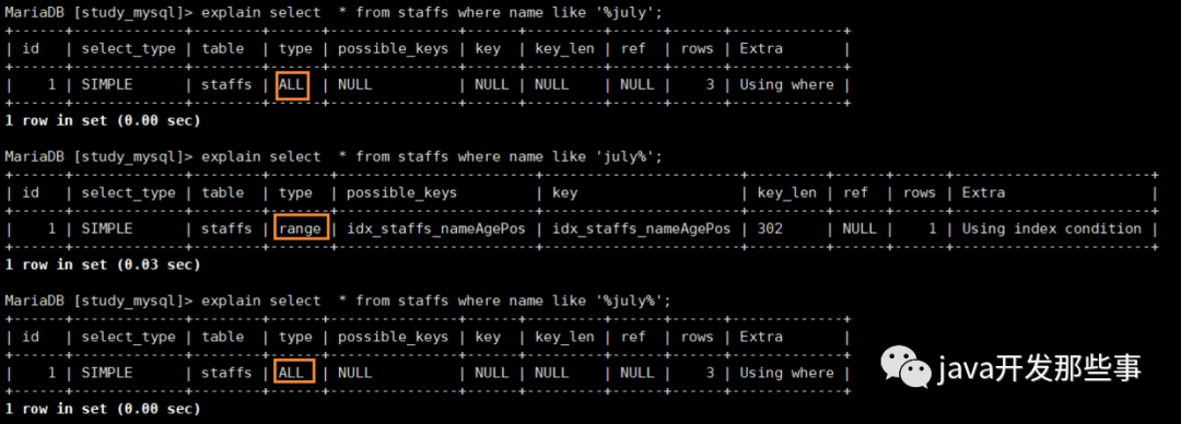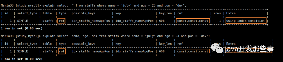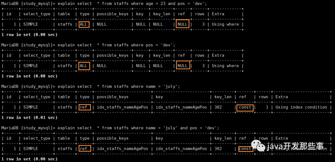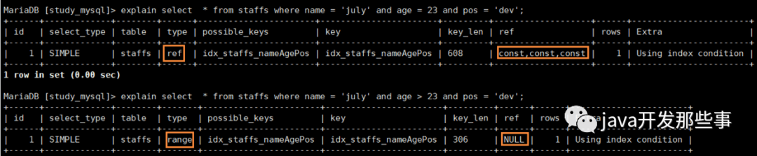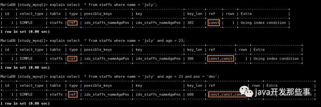第三种情况,就是全值匹配。即我们建立的索引一楼是name,二楼是age,三楼是pos,查询的条件也是先name再age最后pos,从上面图中第三条语句的执行计划可以看出,使用三个const,效率是很高的。