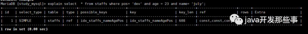 explain select name, age, pos from staffs where name = 'july' and age = 23 and pos = 'dev';