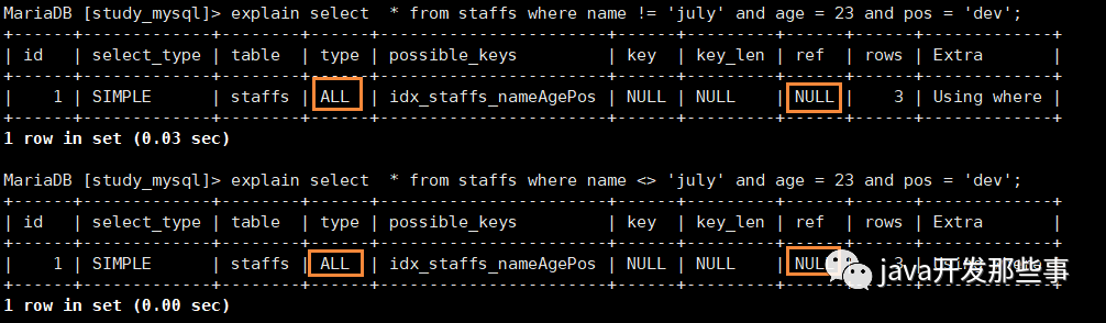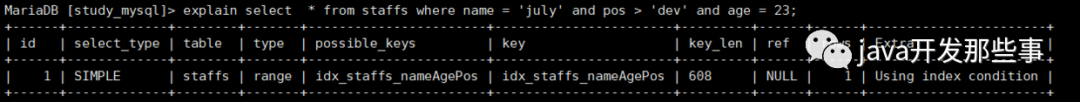 explain select * from staffs where name <> 'july' and age = 23 and pos = 'dev';