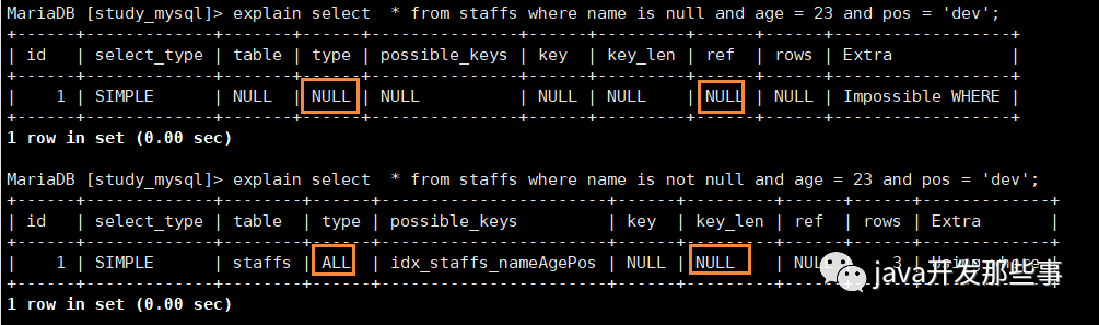 explain select * from staffs where name is null and age = 23 and pos = 'dev';