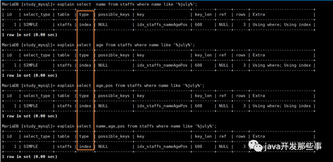 可以看到,如果查询字段和索引列完全一致,或者在索引列的范围内,比如select name, age