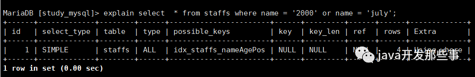 explain select * from staffs where name = 'july' and age = 23 and pos = 'dev';