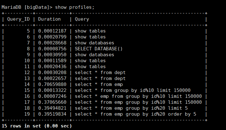 因为上面我们已经开启了profile,所以执行的sql都会被记录到相关文件中,下面我们随便执行几段sql。