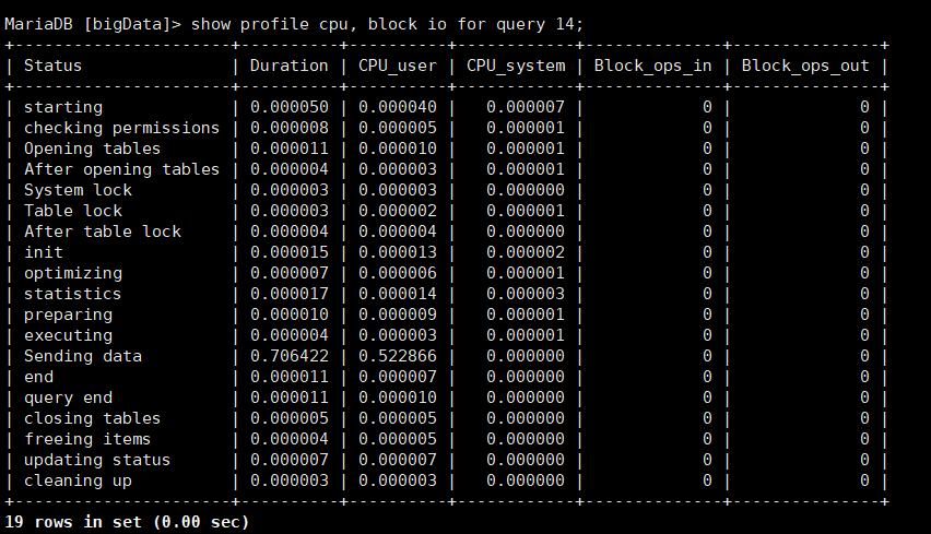 show profile cpu, block io for query 14;