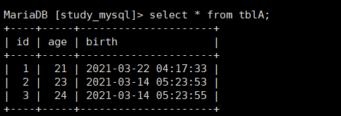 insert tblA(age,birth) values(22,now());