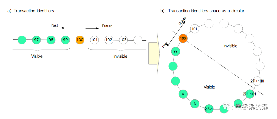 因为在PostgreSQL中,事务ID有限,所以事务ID的使用是循环的。对一个事务来说,在它之前的21亿个事务都属于过去,之后的21亿属于未来。