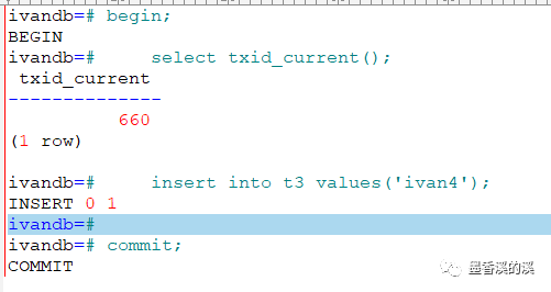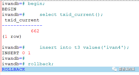 example:ivandb=# begin;BEGINivandb=# select txid_current();txid_current--------------653(1 row)ivandb=# insert into t3 values('ivan4');