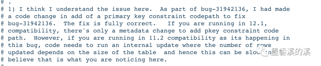 首先,ORACLE 发现为了修复bug-31942136,在代码层面做了更改,同时加了一个主键,这个加主键的动作在12.1以上,是很快的。但是在11.2,就会很慢,而且是根据表的大小会影响快慢。到这里,其实还不太有关系,下面提到了一个关键的点: