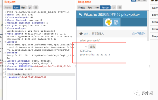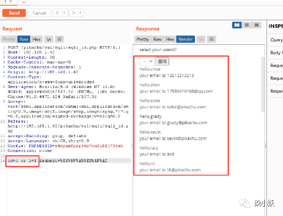 我们将抓到的包发送到repeater里来进行测试,先输入payload:”or 1=1”,在提交: