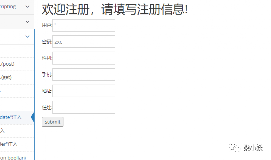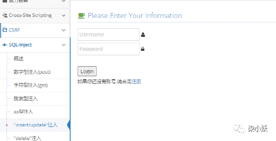 我们先点开注册,当前是insert注入,也就是说,我们前端输入的数据,会通过插入的方式到到数据库里去