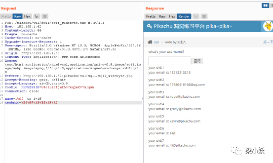 我们们打开目标,并用burp抓包,发送到repeater,输入payload:1%df' or 1=1#