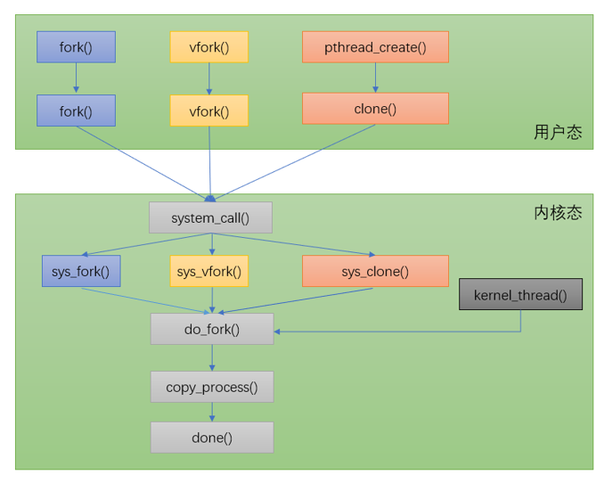 上面介绍了用户态创建进程和线程的方式,以及各个方式的特点。关于其底层的实现本质,我们后面会详细讲解。这里先提供一下三者之间的关系,可见三者最终都会调用 do_fork 实现。