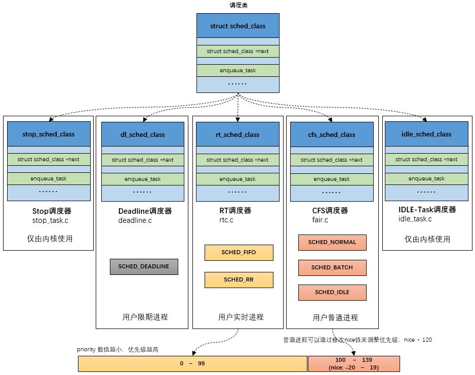 struct sched_class 对调度器进行抽象,一共分为5类: