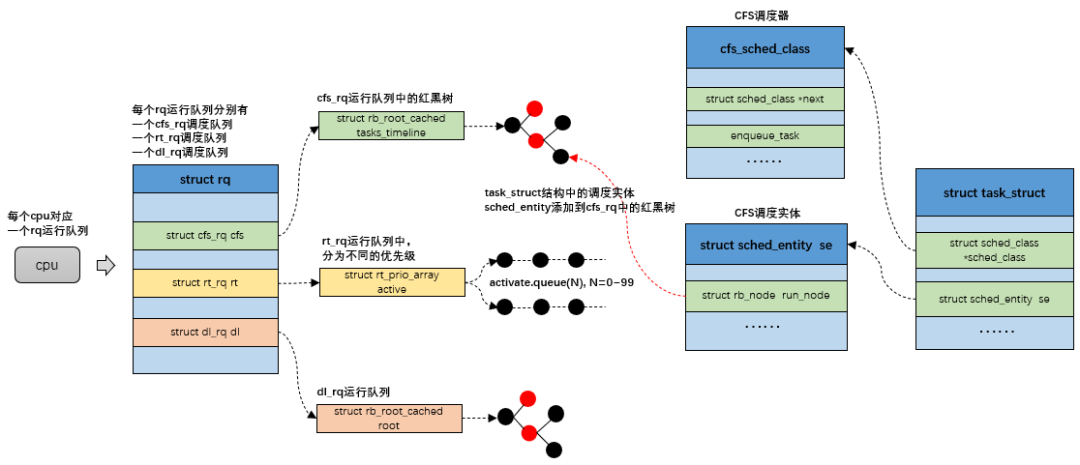 struct cfs_rq cfs; CFS调度队列 struct rt_rq rt; RT调度队列 struct dl_rq dl; DL调度队列