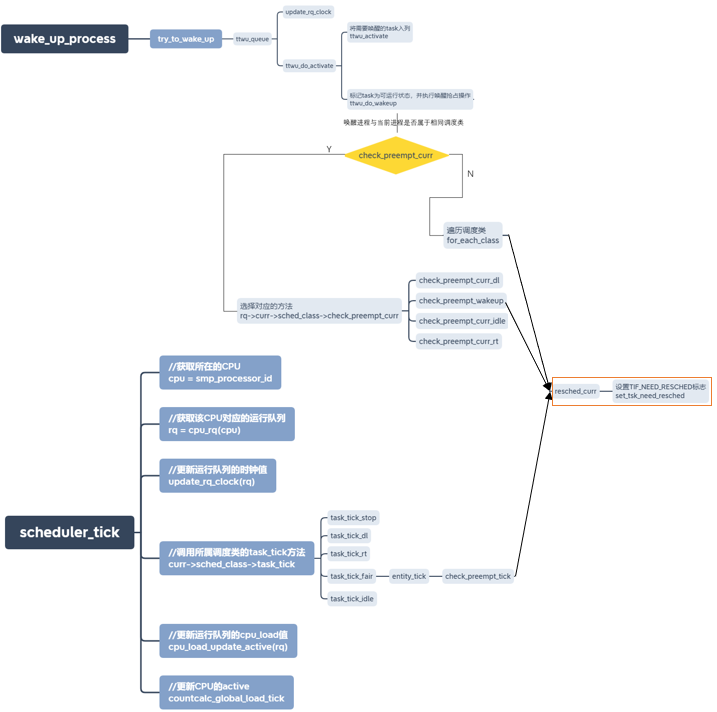 以上情况下都会通过 resched_curr 来设置进程thread_info结构体里的flags成员为TIF_NEED_RESCHED。以 scheduler_tick 和 wake_up_process 为例: