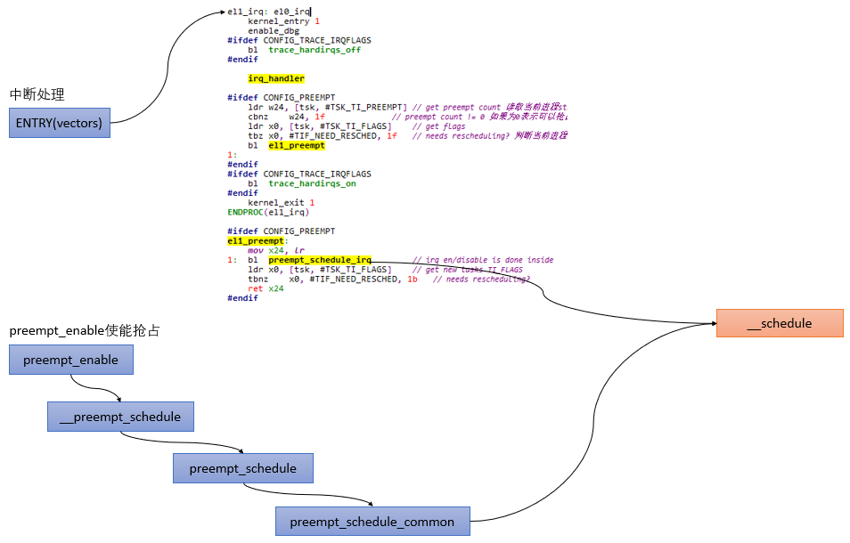 kernel判断当前进程标记是否为TIF_NEED_RESCHED,是的话调用 schedule 函数切换上下文,kernel空间是可以关抢占的,user空间是无法关抢占的。抢占可分为内核态抢占和用户态抢占